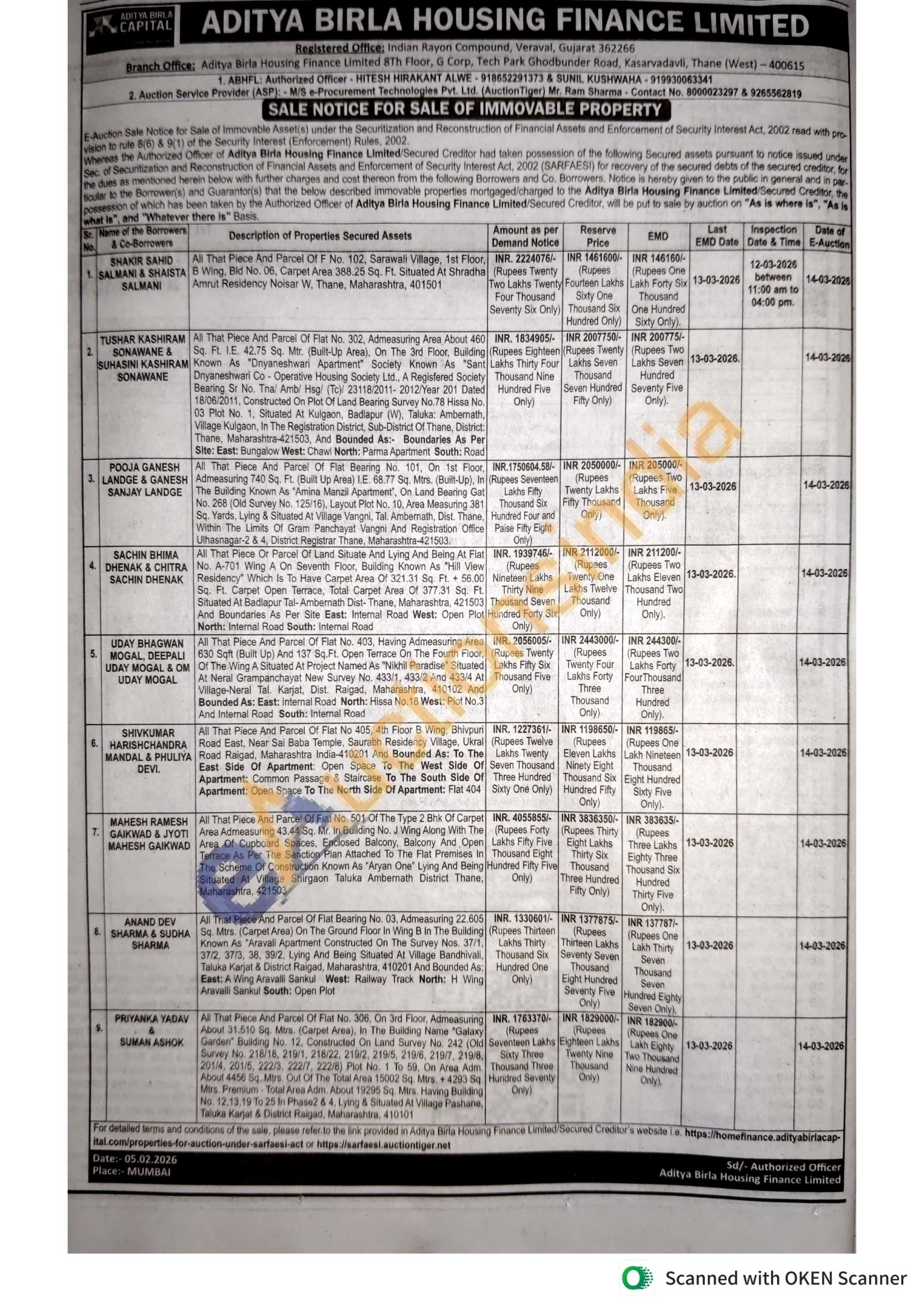 Contact Authorized Officer HITESH HIRAKANT ALWE-918652291373 & SUNIL KUSHWAHA-919930063341