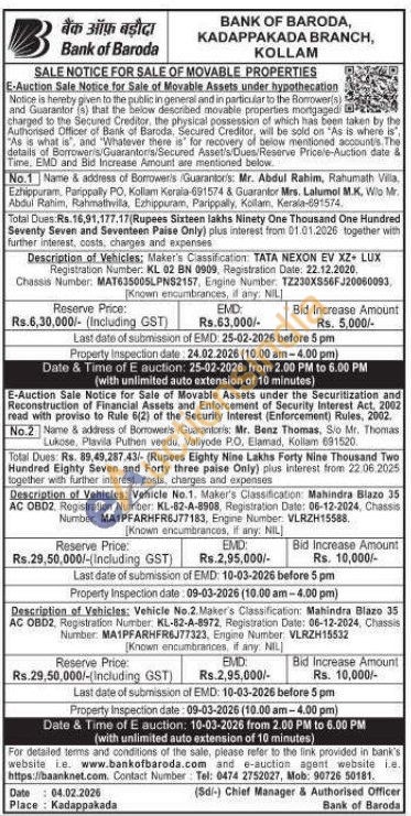 Description of Vehicles: Vehicle No.2. Maker's Classification: Mahindra Blazo 35 AC OBD2, Registration Number KL-82-A-8972, Registration Date: 06-12-2024, Chassis Number: MAIPFARHFR6J77323, Engine Number: VLRZH15532 Known encumbrances, if any: NIL)
