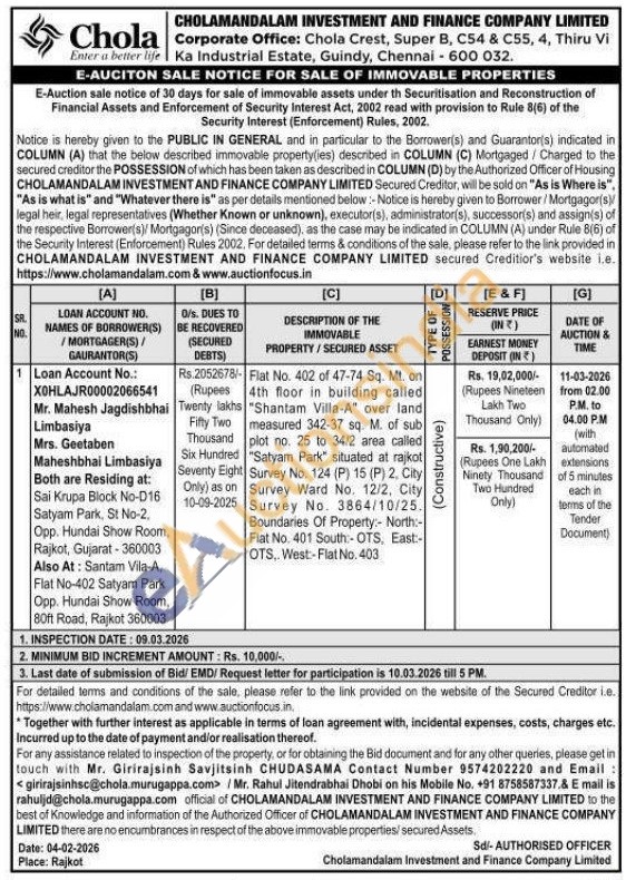 Flat No. 402 of 47-74 Sq. Mt. on 4th floor in building called "Shantam Villa-A" over land measured 342-37 sq. M. of sub plot no. 25 to 34/2 area called "Satyam Park" situated at rajkot Survey No. 124 (P) 15 (P) 2. City Survey Ward No. 12/2, City Survey No. 3864/10/25. Boundaries Of Property:- North:-Flat No. 401 South:-OTS, East:-OTS.. West-Flat No. 403
