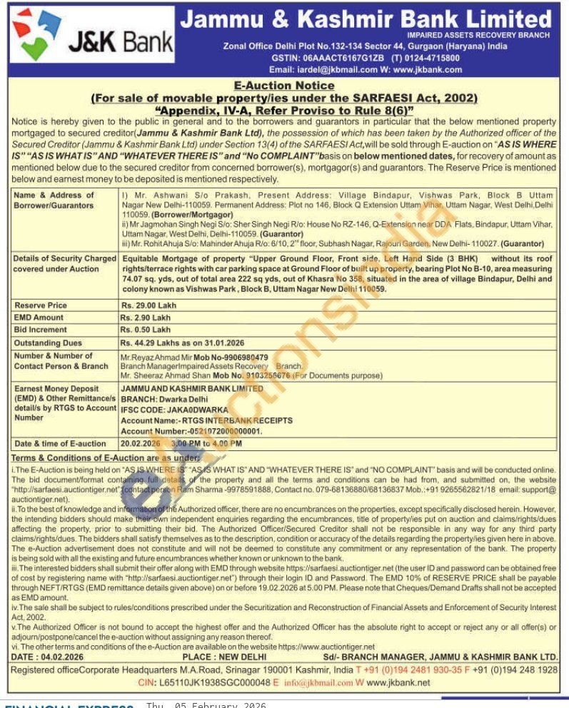 Equitable Mortgage of property "Upper Ground Floor, Front side, Left Hand Side (3 BHK) without its roof rights/terrace rights with car parking space at Ground Floor of built up property, bearing Plot No B-10, area measuring 74.07 sq. yds, out of total area 222 sq yds, out of Khasra No 358, situated in the area of village Bindapur, Delhi and colony known as Vishwas Park, Block B, Uttam Nagar New Delhi 110059
