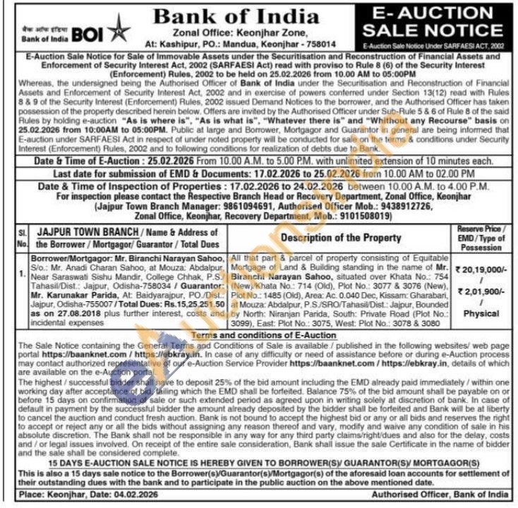 All that part & parcel of property consisting of Equitable , Mortgage of Land & Building standing in the name of Mr. / Biranchi Narayan Sahoo, situated over Khata No.: 754 (New)/Khata No.: 714 (Old), Plot No.: 3077 & 3076 (New), Plot No.: 1485 (Old), Area: Ac. 0.040 Dec, Kissam: Gharabari, at Mouza: Abdalpur, P.S/SRO/Tahasil/Dist. Jajpur, Bounded by North: Niranjan Parida, South: Private Road (Plot No.: 3099), East: Plot No.: 3075, West: Plot No.: 3078 & 3080