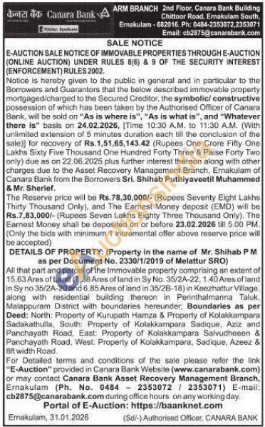 DETAILS OF PROPERTY: (Property in the name of Mr. Shihab PM as per Document No. 2330/1/2019 of Melattur SRO) : All that part and parcel of the Immovable property comprising an extent of 15.63 Ares of Land (7.38 Ares of land in Sy No. 35/2A-22, 1.40 Ares of land in Sy no 35/2A-20 and 6.85 Ares of land in 35/28-18) in Keezhattur Village. along with residential building thereon in Perinthalmanna Taluk. Malappuram District with boundaries hereunder, Boundaries as per Deed: North: Property of Kurupath Hamza & Property of Kolakkampara Sadakathulla, South: Property of Kolakkampara Sadique, Aziz and Panchayath Road, East: Property of Kolakkampara Salvudheeen & Panchayath Road, West: Property of Kolakkampara, Sadique, Azeez & 8ft width Road