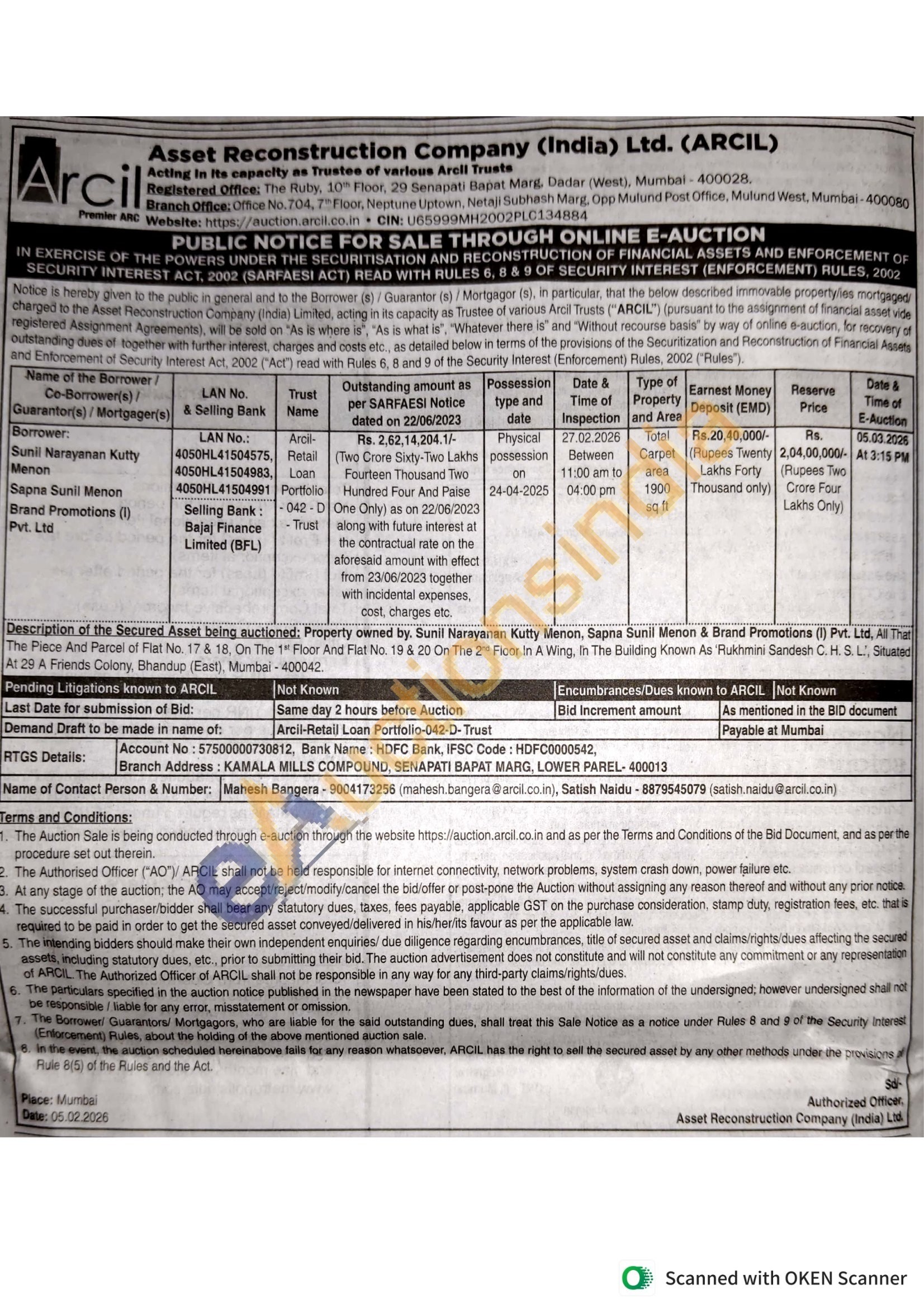 Property owned by. Sunil Narayanan Kutty Menon, Sapna Sunil Menon & Brand Promotions (1) Pvt. Ltd, All Thar The Piece And Parcel of Flat No. 17 & 18, On The 1 Floor And Flat No. 19 & 20 On The 2nd Floor In A Wing, In The Building Known As Rukhmini Sandesh C. H. S. L., Situated At 29 A Friends Colony, Bhandup (East), Mumbai-400042