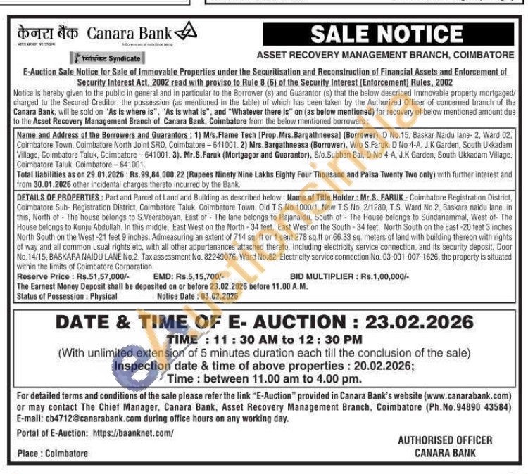 DETAILS OF PROPERTIES: Part and Parcel of Land and Building as described below: Name of Title Holder: Mr.S. FARUK Coimbatore Registration District, Coimbatore Sub-Registration District, Coimbatore Taluk, Coimbatore Town, Old T.S No. 1000/1, New T.S No. 2/1280, T.S. Ward No.2. Baskara naidu lane, in this, North of The house belongs to S.Veeraboyan, East of The lane belongs to Rajanaidu, South of The House belongs to Sundariammal, West of The House belongs to Kunju Abdullah. In this middle, East West on the North-34 feet, East West on the South-34 feet, North South on the East-20 feet 3 inches North South on the West -21 feet 9 inches. Admeasuring an extent of 714 sq. ft or 1 cent 278 sq ft or 66.33 sq. meters of land with building thereon with rights of way and all common usual rights etc, with all other appurtenances attached thereto, Including electricity service connection, and its security deposit, Door No.14/15, BASKARA NAIDU LANE No.2, Tax assessment No. 82249076, Ward No.82, Electricity service connection No. 03-001-007-1626, the property is situated within the limits of Coimbatore Corporation.