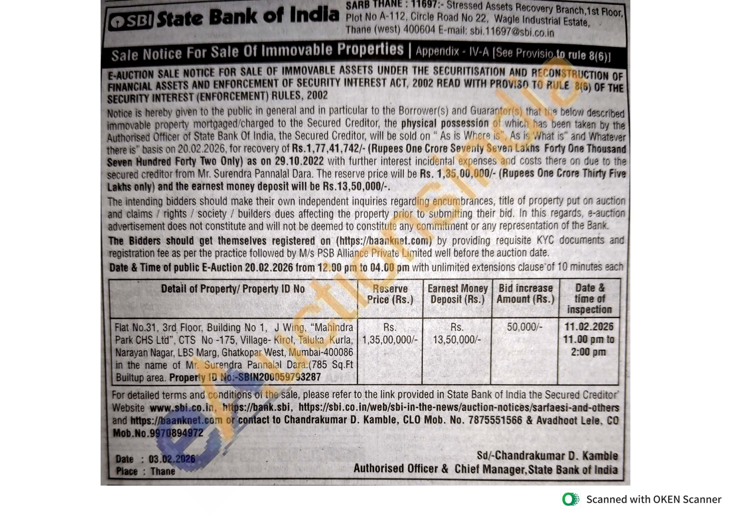 Flat No.31, 3rd Floor, Building No 1, J Wing, "Mahindra Park CHS Lid", CTS No-175, Village- Kirol, Taluka Kurla, Narayan Nagar, LBS Marg, Ghatkopar West, Mumbai-400086 in the name of Mr. Surendra Pannalal Dara. (785 Sq.Ft Builtup area. Property ID No:-SBIN200059793287