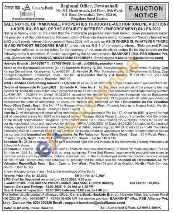 Details of Immovable Property/IES: Schedule A: Item No 1: All that piece and parcel of the property bearing present VP khata No 15030040102575 converted SI No 151/4 (Converted vide conversion certificate bearing number ALN(HK). SR. 104/2013-14, Dated 10.02.2014 issued by the deputy commisiopner Bangalore district Bangalore) situated at Hoskote Village, Kasaba Hobli, Hoskote Taluk, Totally measuring 13 guntas with all rights appurtenance whatsoever herunder or underneath or above the surface and bounded on the Boundaries As Per Valuation Report/Sale Deed: East: Site No 117 in Nisarga Hitech Layout, West: Property belorigs to Nagala Naidu, North: Nisarga Hitech Layout, South: Nisarga Hitech Layout. Item No 2: All that piece and parcel of the immovable property bearing of Plot No 117, Khata No 1051, a layout formed out of converted survey No 150/1 in the layout named "Nisarga Hitech Phase 2 Layout, "(converted vide the orders of the deputy commissioner Bangalore Rural District dated 03.10.2009 bearing No ALN(H)SR:77/2009-10) and as per the residential layout plan approved by vide no: HPA/LAO/05/2009-10 Dated 24.09.2010 situated at Kannurahali Village, Kasaba Hobli, Hosakote Taluk, Bengaluru Rural District, measuring ((26.09 39.55 mtrs)/2)x 16.46 mtrs totally measuring 540.20 sq mtrs or 5814.89 sq ft with all rights appurtenance whatsoever herunder or underneath or above the surface and bounded on the Boundaries As Per Valuation Report/Sale Deed: East: 80 ft Road, West: Private Property, North Site No 118,119,120 & 121. South: Site No 116 & 115. Schedule B: 35.28 sq mirs or 379.75 sq ft undivided right title and interest in the immovable property mentioned in Schedule A above. Schedule C: Flat No. 107, in the First Floor, E-Khata No 150300401000120478, in Block "B" measuring about 124.03 Sq mtrs or 1335 Sq. feets super built up area, containing Three Bed Rooms, together with proportionate share in common areas such as passages, lobbies, staircase, etc., in the multi-storeyed residential building complex known as "VR PEARL constructed over schedule "A" property and the above said flat bounded on: Boundaries As Per Valuation Report/Sale Deed: East: Open to Sky, West: Flat No. 108 and Wide Corridor. North: Wide Corridor, South: Open to Sky