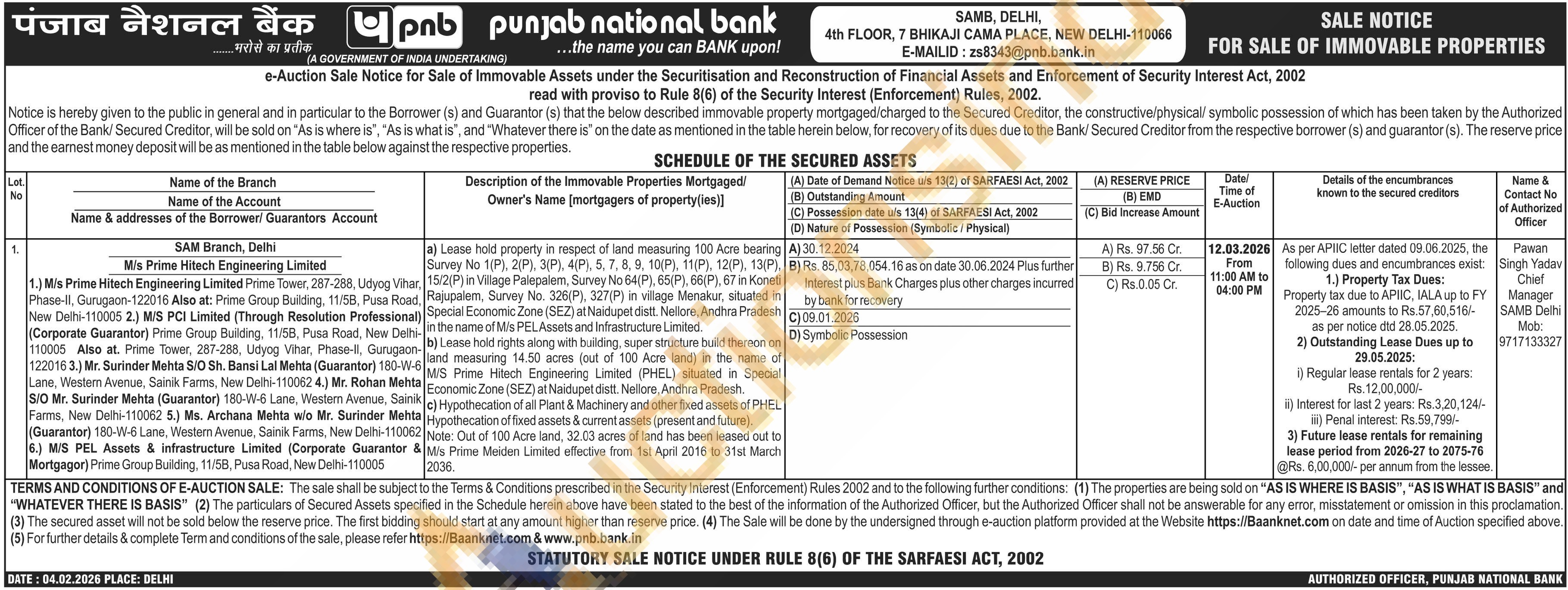 a) Lease hoid property in respect of land measuring 100 Acre bearing Survey No 1(P), 2(P), 3(P), 4(P), 5, 7, 8, 9, 10(P) 11(P) 11(P), 12(P), 13(P) 13(P) 15/2(P) in Village Palepakern, Survey No 64(P). 65(P) 66(P), 67 in Koneti Rajupalem, Survey No. 326(P). 327(P) in village Menakur situated in Soocial Economic Zone (SEZ) at Naidupet distt. Nellore. Andhra Pradesh and measuring 14.50 acres (out of 100 Acre and) in the name of b) Lease hold rights along with buiding, super structure build thereon on MS Prime Hitech Engineering Limited (PHEL) situated in Special Economic Zone (SEZI at Naidupet distt. Nellore, Andhra Pradesh Economic Zone (SEZ) at Andhra Pradesh c) Hypothecation of all Plant & Machinery and other fixed assets of PHEL Hypothecation of fixed assets & current assets (present and future). Note: Out of 100 Acre land, 32.03 acres of land has been leased out to M's Prime Meiden Limited effective franı 1st April 2016 to 31st March 2036