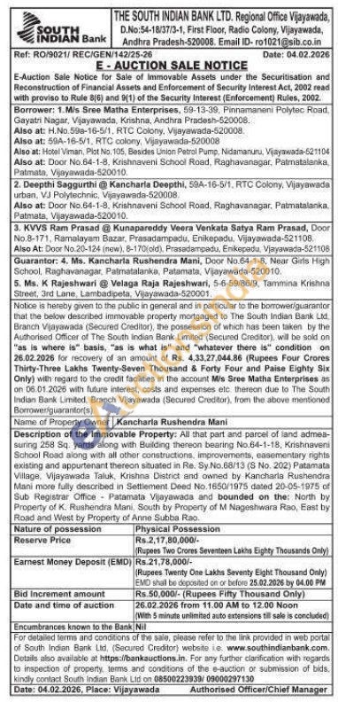 Description of the Immovable Property: All that part and parcel of land admea-suring 258 Sq. yards along with Building thereon bearing No.64-1-18, Krishnaveni School Road along with all other constructions, improvements, easementary rights existing and appurtenant thereon situated in Re. Sy. No.68/13 (S No. 202) Patamata Village, Vijayawada Taluk, Krishna District and owned by Kancharla Rushendra Mani more fully described in Settlement Deed No. 1650/1975 dated 20-05-1975 of Sub Registrar Office Patamata Vijayawada and bounded on the: North by Property of K. Rushendra Mani, South by Property of M Nageshwara Rao, East by Road and West by Property of Anne Subba Rao.
