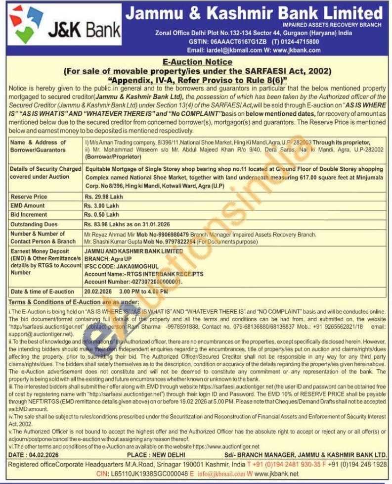 Equitable Mortgage of Single Storey shop bearing shop no.11 located at Ground Floor of Double Storey shopping Complex named National Shoe Market, together with land underneath measuring 617.00 square feet at Minjumala Corp. No 8/396, Hing ki Mandi, Kotwali Ward, Agra (U.P)