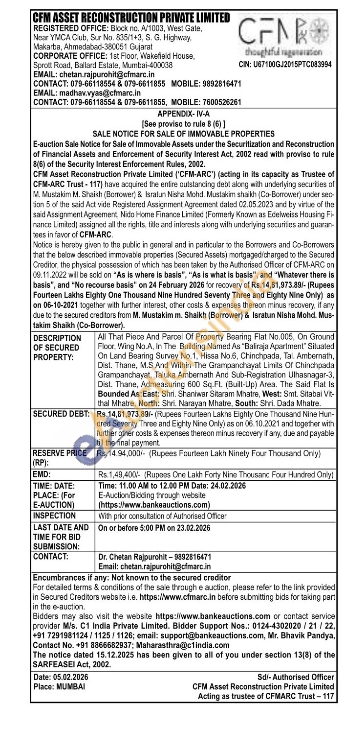 All That Piece And Parcel Of Property Bearing Flat No.005, On Ground Floor, Wing No.A, In The Building Named As "Baliraja Apartment Situated On Land Bearing Survey No.1, Hissa No.6, Chinchpada, Tal. Ambernath, Dist. Thane, M.S And Within The Grampanchayat Limits Of Chinchpada Grampanchayat, Taluka Ambernath And Sub-Registration Ulhasnagar-3, Dist. Thane, Admeasuring 600 Sq.Ft. (Built-Up) Area. The Said Flat Is Bounded As: East: Shri. Shaniwar Sitaram Mhatre, West: Smt. Sitabai Vit-thal Mhatre, North: Shri. Narayan Mhatre, South: Shri. Dada Mhatre.