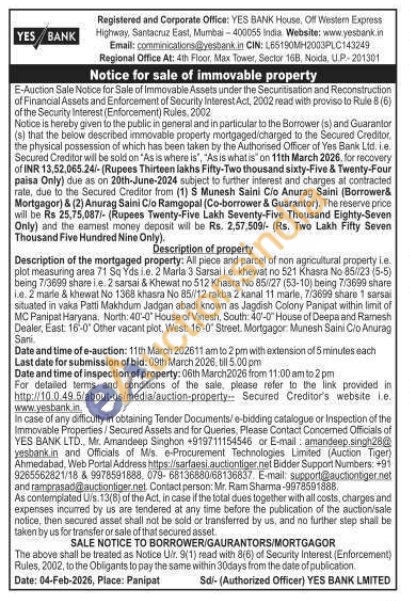 Description of the mortgaged property: All piece and parcel of non agncultural property ie. plot measuring area 71 Sq Yds ie. 2 Marla 3 Sarsalle. khewat no 521 Khasra No 85/23 (5-5) being 7/3699 share i e 2 sarsai & Khewat no 512 Khasra No 85/27 (53-10) being 7/3699 share Le. 2 marle & khewat No 1368 khasra No 85//12 rakba 2 kanal 11 marte, 7/3699 share 1 sarsal situated in vaka Patti Makhdum Jadgan abadi known as Jagdish Colony Panipat within limit of MC Panipat Haryana, North: 40-0 House of Vinesh, South: 40-0 House of Deepa and Ramesh Dealer, East: 16-0' Other vacant plot. West: 16-0' Street. Mortgagor Munesh Saini Cio Anurag Sani