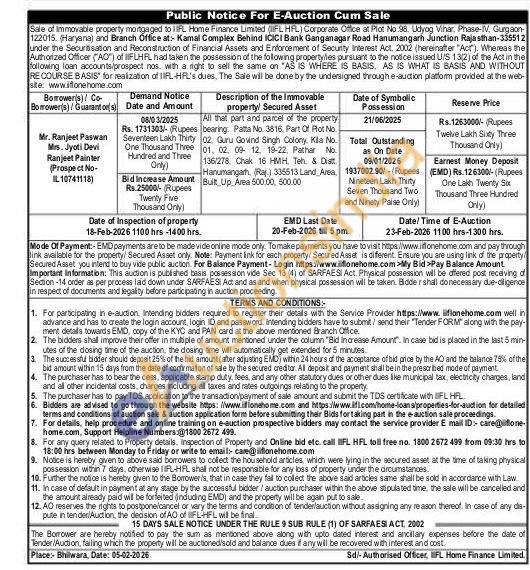 All that part and parcel of the property bearing Patta No. 3816, Part Of Plot No. 02. Guru Govind Singh Colony, Kia No. 01. 02. 09- 12. 19-22. Pathar No. 136/278, Chak 16 HMH, Teh & Dist Hanumangarh, (Raj.) 335513 Land Area, Built Up Area 500.00, 500.00