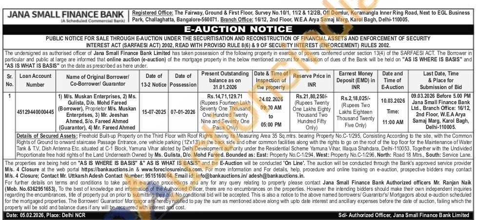 Details of Secured Assets: Freehold Built-up Property on the Third Floor with Roof Rights having its Measuring Area 35 Sq.mtrs. bearing Property No.C-1/295, Consisting According to the site, with the Common Rights of Ground to onward staircase Passage Entrance, one vehicle parking (12'x13) In the back side and other common facilities along with the rights to go on the roof of the top floor for the Maintenance of Water Tank & T.V, Dish Antenna Etc. situated at C-1 Block, Yamuna Vihar alloted by Delhi Development authority under the Residential Scheme Yamuna Vihar, Illaqua Shahdara, Delhi-110053, Together with the Undivided Proportionate free hold rights of the Land Underneath Owned by Ms. Gulista, D/o. Mohd Fareed. Bounded as: East: Property No.C-1/294, West: Property No. C-1/296, North: Road 18 Mtrs., South: Service Lane.