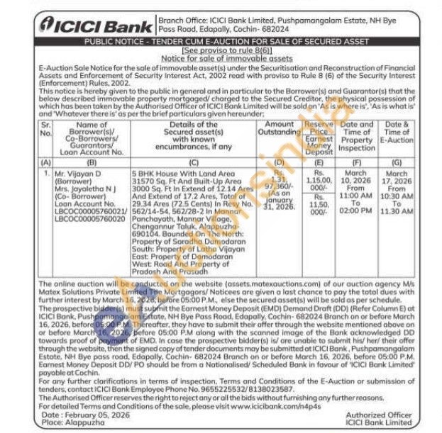 5 BHK House With Land Area 31570 Sq. Ft And Built-Up Area 3000 Sq. Ft in Extend of 12.14 Ares And Extend of 17.2 Ares, Total of 29.34 Ares (72.5 Cents) In Resy No. 562/14-54, 562/28-2 In Mannar Panchayath, Mannar Villoge. Chengannur Taluk, Alappuzha-690104. Bounded On The North: Property of Soradha Damodaran South: Property of Latha Vijayan East: Property of Damodaran West: Road And Property of Pradosh And Prasadh