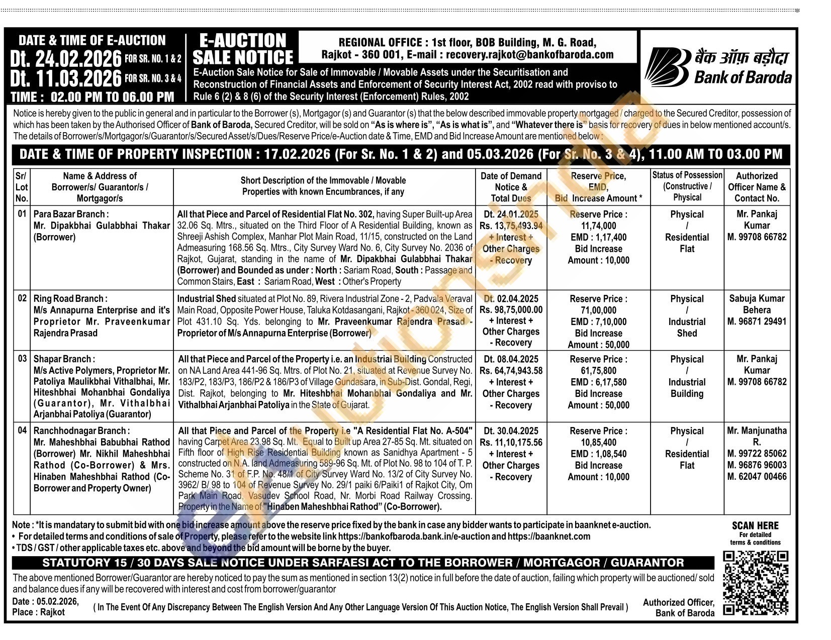 All that Piece and Parcel of Residential Flat No. 302, having Super Built-up Area 32.06 Sq. Mtrs., situated on the Third Floor of A Residential Building, known as Shreeji Ashish Complex, Manhar Plot Main Road, 11/15, constructed on the Land Admeasuring 168.56 Sq. Mtrs., City Survey Ward No. 6, City Survey No. 2036 of Rajkot, Gujarat, standing in the name of Mr. Dipakbhai Gulabbhai Thakar (Borrower) and Bounded as under: North: Sariam Road, South: Passage and Common Stairs, East: Sariam Road, West: Other's Property