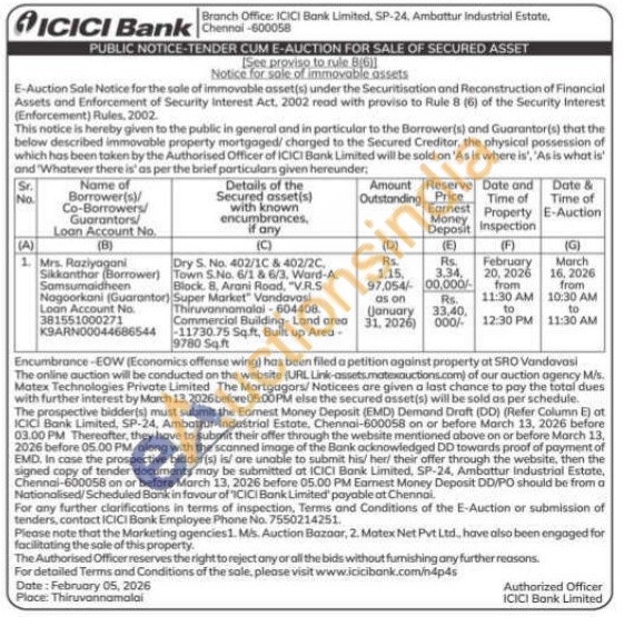 Dry S. No. 402/10 & 402/20 Town S.No. 6/1 & 6/3, Ward-A. Block. 8, Arani Road, "V.R.S Super Market" Vandavasi Thiruvannamalai-604408. Commercial Building-Land area -11730.75 Sq.ft, Built up Area-9780 Sq.ft