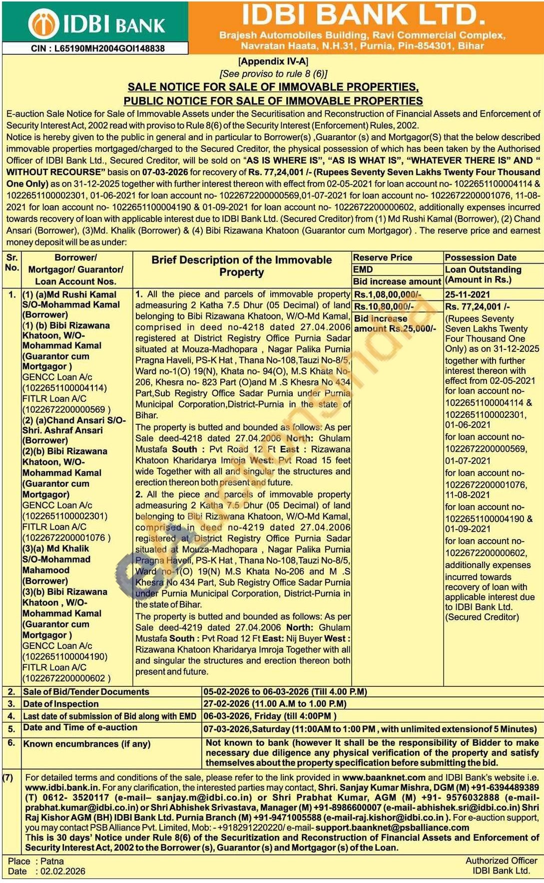 1. All the piece and parcels of immovable property admeasuring 2 Katha 7.5 Dhur (05 Decimal) of land belonging to Bibi Rizawana Khatoon, W/O-Md Kamal, comprised in deed no-4218 dated 27.04.2006 registered at District Registry Office Purnia Sadar situated at Mouza-Madhopara, Nagar Palika Purnia Pragna Haveli, PS-K Hat, Thana No-108, Tauzi No-8/5, Ward no-1(0) 19(N), Khata no- 94(O), M.S Khata No-206, Khesra no-823 Part (O)and M.S Khesra No 434 Part Sub Registry Office Sadar Purnia under Purnia Municipal Corporation, District-Purnia in the state of Bihar.