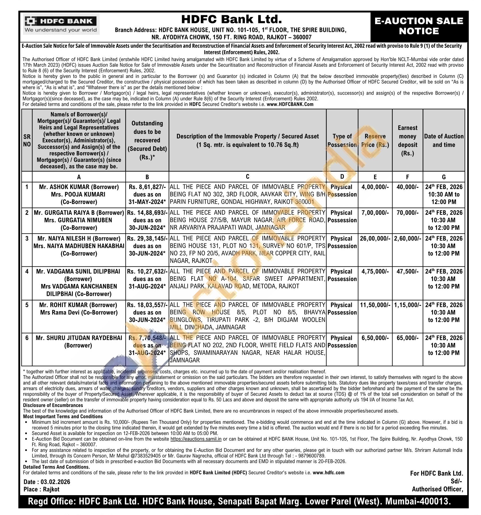 ALL THE PIECE AND PARCEL OF IMMOVABLE PROPERTY BEING FLAT NO 202, 2ND FLOOR, WHITE FIELD FLATS AND SHOPS, SWAMINARAYAN NAGAR, NEAR HALAR HOUSE, JAMNAGAR