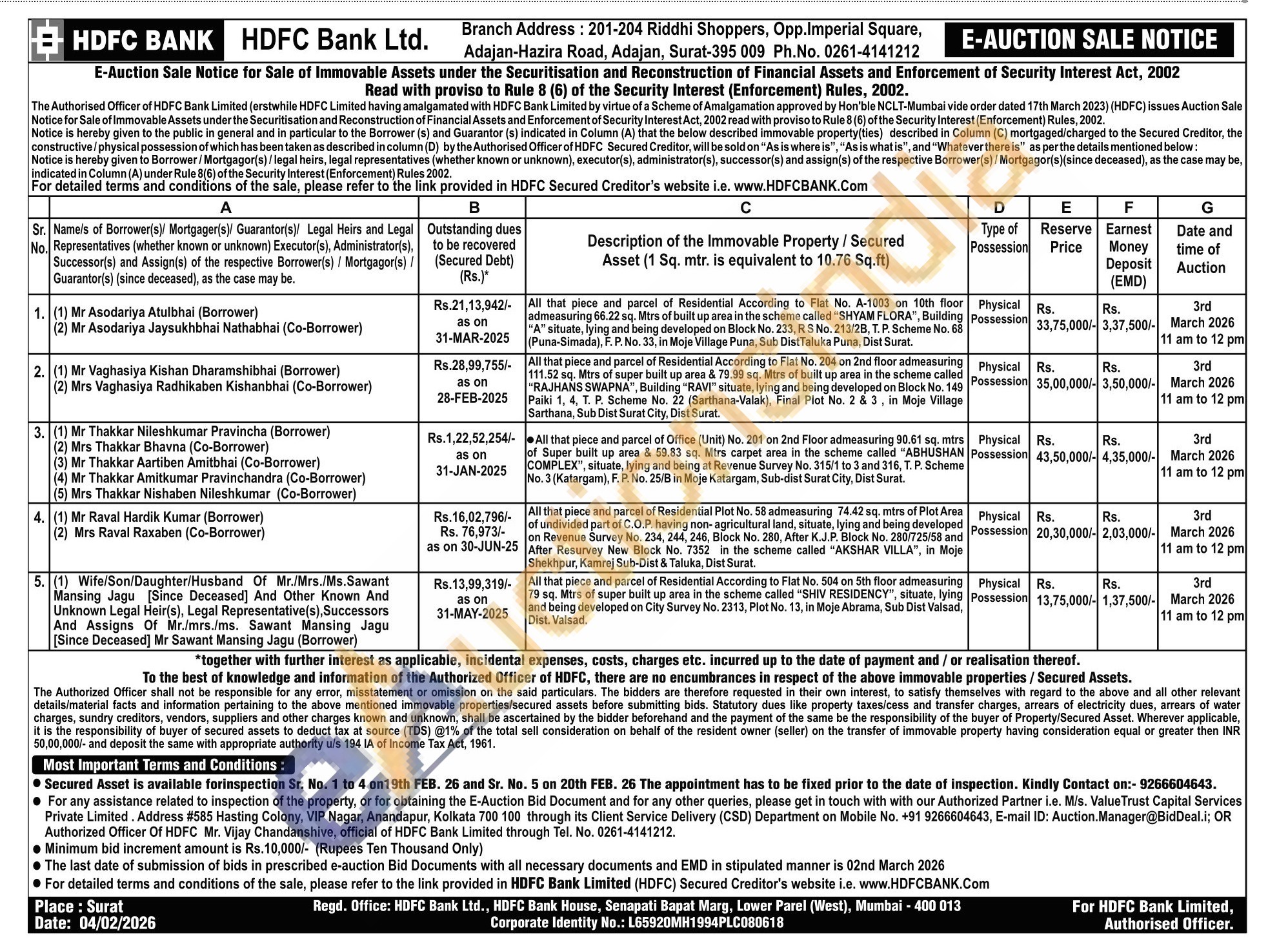 All that piece and parcel of Residential According to Flat No. A-1003 on 10th floor admeasuring 66.22 sq. Mtrs of built up area in the scheme called "SHYAM FLORA"Building situate, lying and being developed on Block No. 233, R S No. 213/2B, T. P. Scheme No. 68 (Puna-Simada), F. P. No. 33, in Moje Village Puna, Sub Dist Taluka Puna, Dist Surat