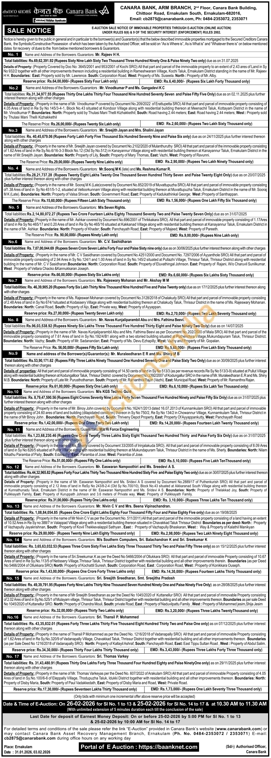 Details of Property: (Property in the name of Mr. Ashkar covered by Document No.696/2001 of Thrikkakara SRO). All that part and parcel of immovable property consisting of 1.17Ares of land in Re Sy No 465/17 and 0.20 Ares of land in Re Sy No 465/16 situated at Kakkanad Village along with residential building thereon at Kanayannur Taluk, Ernakulam District in the name of Mr. Ashkar. Boundaries: North: Property of Khader, South: Panchayath Road: East: Property of Majeed; West: Property of Pareeth.