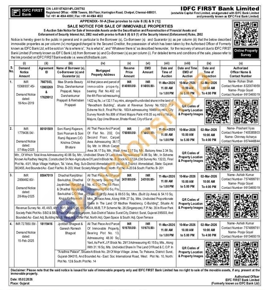 All That Piece And Parcel Of Property Bearing Flat No. 402 On The 4th Floor, Admeasuring 900 Sq. Fts. (Super Built Up Area) & 69.53 Sq. Mtrs. (Built Up Area) & 54.10 Sq. Mtrs. Terrace Area, Along With 27 Sq. Mtrs. Undivided Proportionate Share In The Land Of Madhav Residency, C-Building", Situate At Revenue Survey No. 45, 46/3, 48/1,50/1,50/2, 65/1, 65/2, 66/A, 66/B, T.P. Scheme No. 26 (Singanpore), F.P. No. 35 In River Park Society Paiki Plot No. SB/2 & SB/3 Paiki Of Moje Singanpore, Sub-District Taluka: Surat City, District Surat, Gujarat-395003, And Bounded As: - East: Adj. Building No. B, West: Adj. Other Flat, North: Adj. Open Space & South: Adj. Open Terrace