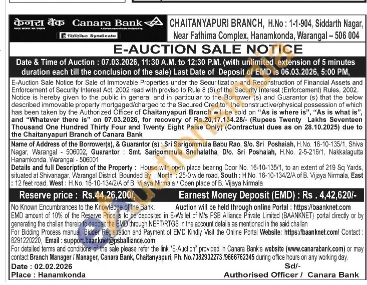 Details and full Description of the Property: House with open place bearing Door No. 16-10-135/1, to an extent of 219 Sq Yards, situated at Shivanagar, Warangal District. Bounded By: North: 25-0 wide road, South: H.No. 16-10-134/2/A of B. Vijaya Nirmala, East : 12 feet road. West: H.No. 16-10-134/2/A of B. Vijaya Nirmala / Open place of B. Vijaya Nirmala