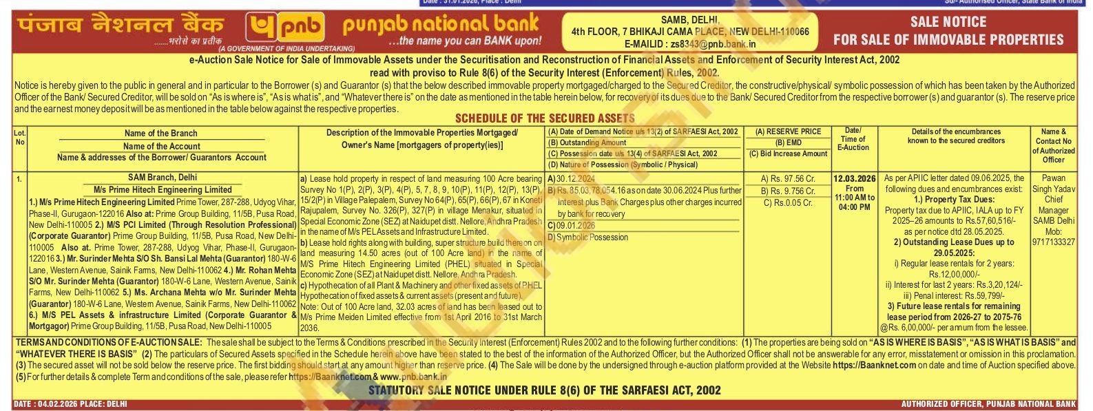 a) Lesase hold property in respect of land measuring 100 Acre bearing Survey No 1(P) 21P), 3(P), 4(P), 5, 7, 8, 8, 10(P), 11(P) 12/PI, 13(P) 15/21P) in Village Palepalem, Survey No 64(P). 65(P) 66(P). 67 in Koneti Hajupalem Rajuqalem, Survey No. 326(P), 327(P) in village Mera Merakur, situated in Special Economic Zone (SEZ) at Naidupet distt. Noflore Andhra Pradesh the name of Mis PEL Assets and infrastructure Limiled.b) Leese hold rights song with building, super structure build there on on and measuring 1450 acres jost of 100 Acre land) in the name of MIS Prime Hitech Engineering Limited (PHEL) situated in Special Economic Zone (SEZ) at Naidupet distt. Nellore, Andhra Pradesh, Hypothecation of all Phant & Machinery and other fixed assets of PHEL Hypothecation of fixed assets & parent assets (present and futum) Note: Out Out of of 100 100 Acre land, 32.03 acres of land has been leased out to & Mis Prime Meiden Limited effective from 1st April 2016 to 31st March 2036.