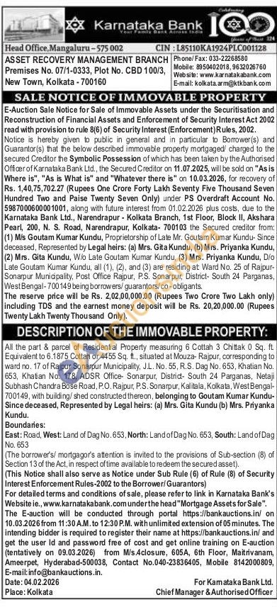 All the part & parcel of Residential Property measuring 6 Cottah 3 Chittak 0 Sq. ft Equivalent to 6.1875 Cottah or 4455 Sq. ft., situated at Mouza- Rajpur, corresponding to ward no. 17 of Rajpur Sonarpur Municipality, J.L. No. 55, R.S. Dag No. 653, Khatian No. 653, Khatian No. 178, ADSR Office Sonarpur, District- South 24 Parganas, Netaji Subhash Chandra Bose Road, P.O. Rajpur, P.S. Sonarpur, Kalitala, Kolkata, West Bengal-700149, with building/shed constructed thereon, belonging to Goutam Kumar Kundu-Since deceased, Represented by Legal heirs: (a) Mrs. Gita Kundu (b) Mrs. Priyanka Kundu. Boundaries: East: Road, West: Land of Dag No. 653, North: Land of Dag No. 653, South: Land of Dag No. 653