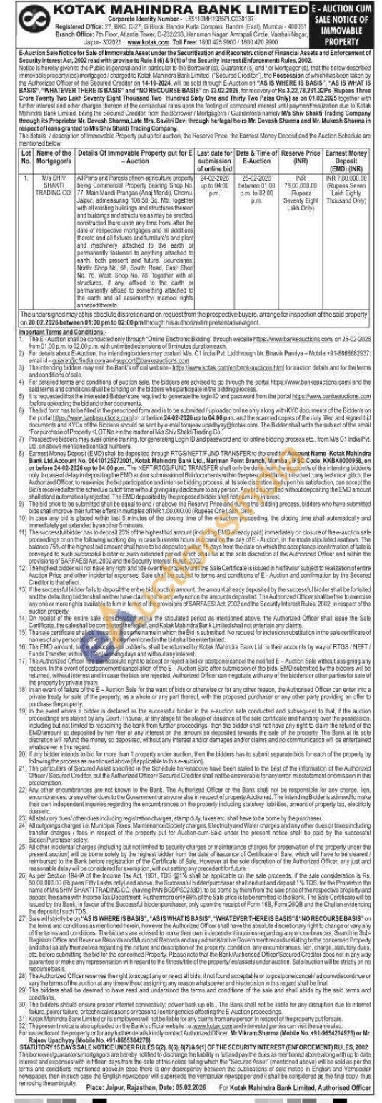 Al Parts and Parcels of non-agriculture property being Commercial Property bearing Shop No 77, Main Mandi Prangan (Anaj Mandij, Chomu, Jaipur, admeasuring 108.58 Sq. Mtr together with all existing buildings and structures thereon and buildings and structures as may be erected constructed there upon any time from after the date of respective mortgages and all additions Thereto and all fixtures and furniture's and plant and machinery attached to the earth or permanently fastened to anything attached to earth, both present and future. Boundaries North: Shop No. 66, South Road, East: Shop No. 76, West Shop No. 78 Together with all structures, if any, affixed to the earth or permanently affaed to something attached to the earth and all easementry mamool rights annexed thereto