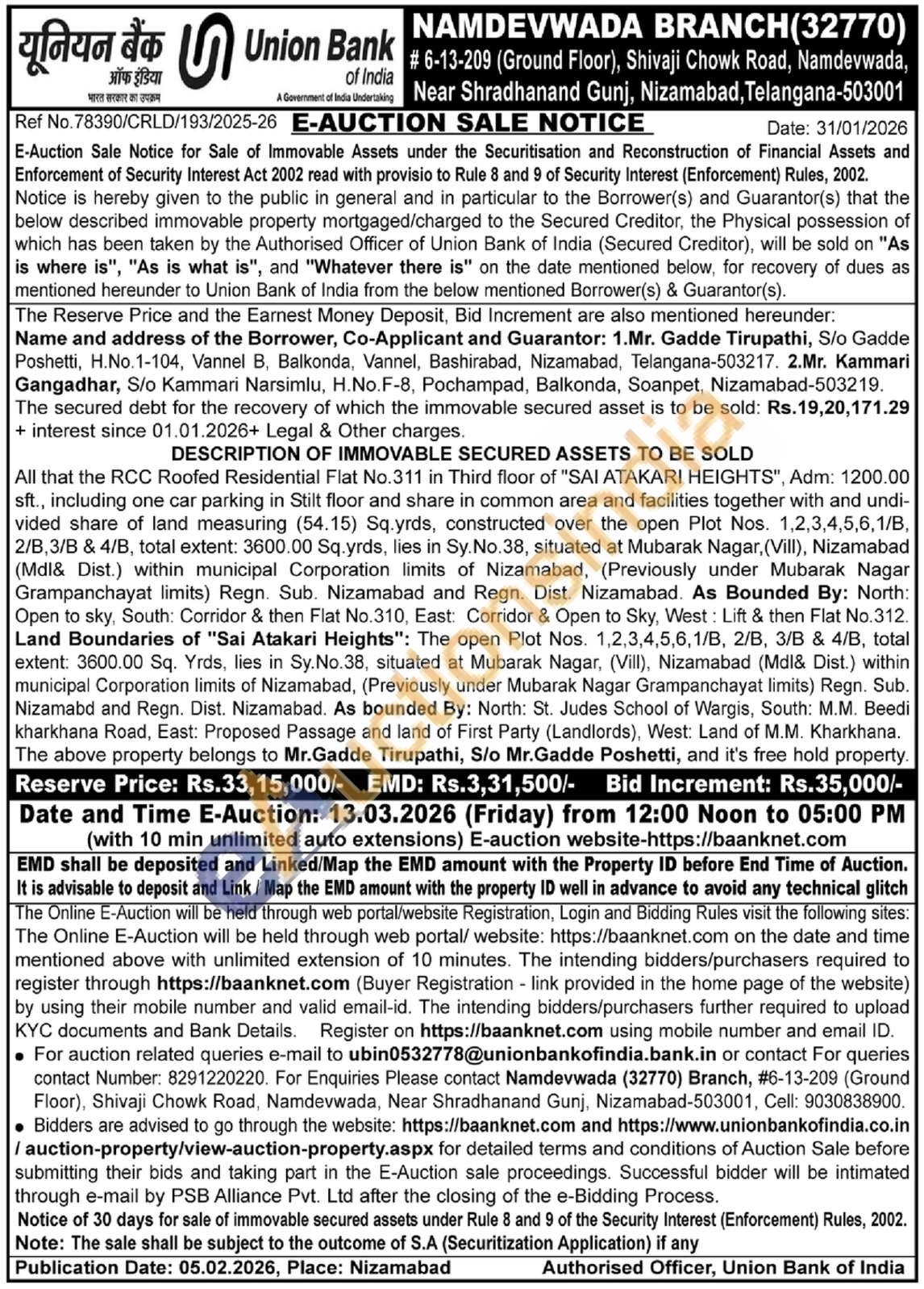 All that the RCC Roofed Residential Flat No.311 in Third floor of "SAI ATAKARI HEIGHTS", Adm: 1200.00 sft., including one car parking in Stilt floor and share in common area and facilities together with and undi-vided share of land measuring (54.15) Sq.yrds, constructed over the open Plot Nos. 1,2,3,4,5,6,1/B, 2/B,3/B & 4/B, total extent: 3600.00 Sq.yrds, lies in Sy. No.38, situated at Mubarak Nagar, (Vill), Nizamabad (Mdl& Dist.) within municipal Corporation limits of Nizamabad, (Previously under Mubarak Nagar Grampanchayat limits) Regn. Sub. Nizamabad and Regn. Dist. Nizamabad. As Bounded By: North: Open to sky, South: Corridor & then Flat No.310, East: Corridor & Open to Sky, West: Lift & then Flat No.312. Land Boundaries of "Sai Atakari Heights": The open Plot Nos. 1,2,3,4,5,6,1/B, 2/B, 3/B & 4/B, total extent: 3600.00 Sq. Yrds, lies in Sy.No.38, situated at Mubarak Nagar, (Vill), Nizamabad (Mdl& Dist.) within municipal Corporation limits of Nizamabad, (Previously under Mubarak Nagar Grampanchayat limits) Regn. Sub. Nizamabd and Regn. Dist. Nizamabad. As bounded By: North: St. Judes School of Wargis, South: M.M. Beedi kharkhana Road, East: Proposed Passage and land of First Party (Landlords), West: Land of M.M. Kharkhana. The above property belongs to Mr.Gadde Tirupathi, S/o Mr.Gadde Poshetti, and it's free hold property.