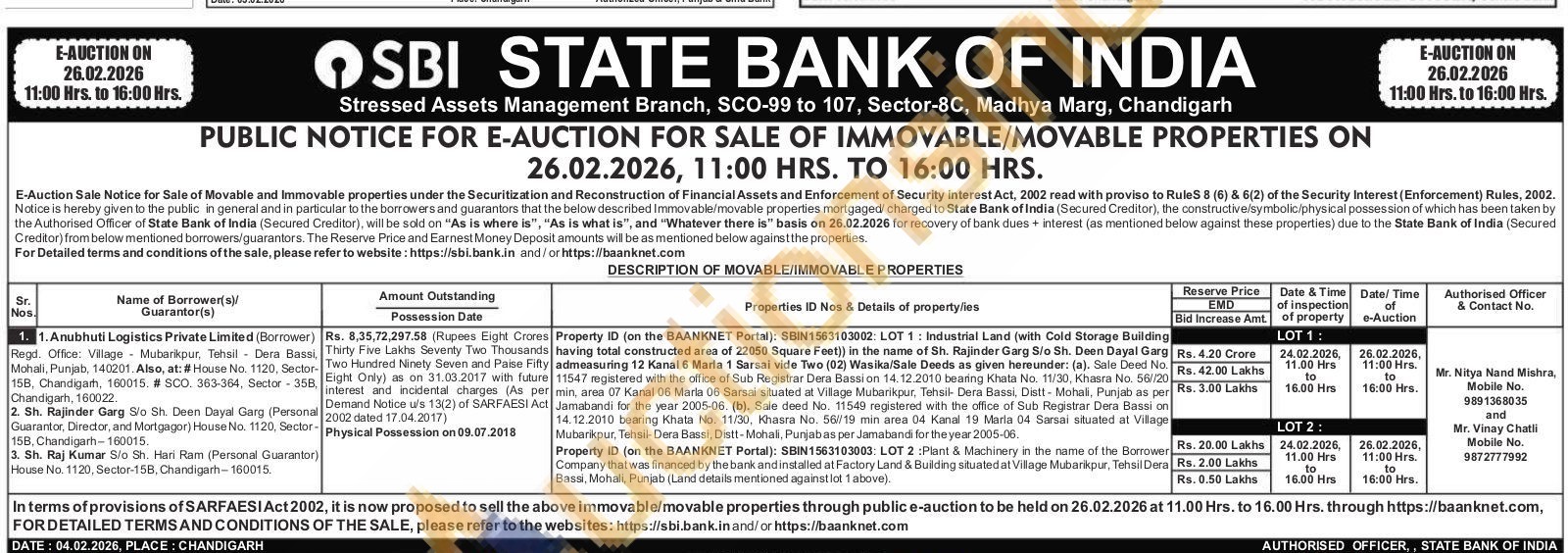 Plant & Machinery in the name of the Borrower Company that was financed by the bank and installed at Factory Land & Building situated at Village Mubarikpur, Tehsil Dera Bassi, Mohali, Punjab (Land details mentioned against lot 1 above).