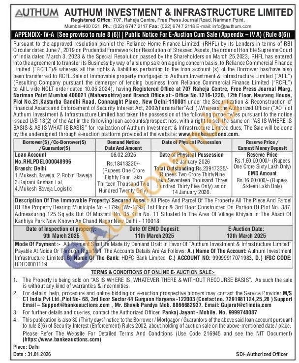 Description Of The Immovable Property/Secured Asset: All Piece And Parcel Of The Property All The Piece And Parcel Of The Property Bearing Municiple No 179a (Wz-179a) 1st Floor & 3rd Floor Constructed On Portion Of Plot No. 387, Admeasuring 125 Sq.yds Out Of Mustatil No. 35 Killa No. 11 Situated In The Area Of Village Khiyala In The Abadi Of Kanhiya Park Now Known As Chand Nagar New Delhi - 110018