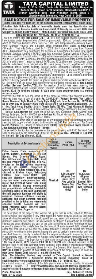 Entire Ground Floor, measuring 115 sq.yds. approx., consisting of Two Bed Rooms, One Drawing/Dining Room, One Kitchen and Two Toilet/Bath, in/of the said Property bearing No. 110-A/3, erected on the plot of land measuring 115 sq. yds. approx., comprised in Khasra No. 15, Khata Khatauni No. 2/20, situated at Krishna Nagar, Safdarjung Enclave, New Delhi-110029, with separate electricity meter/connection, separate water meter/connection with motor and overhead water tank, along with all fittings, fixtures connections and proportionate undivided, indivisible ownership rights in the land underneath the said property, together with rights to use/avail common entrance staircase, passages and other common facilities provided in the building and easements attached thereto. Bounded As: East: Other Property; West: 110-A/4; North: Road: South: Other Property.