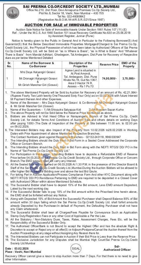 Agree Land is situated in At. Post Amondi, Tal. Ambegaon, Dist. Pune Khate No. 19, Gut No.1067, Area 0 Hector 74 R. Assess - Rs 1 Ps 70