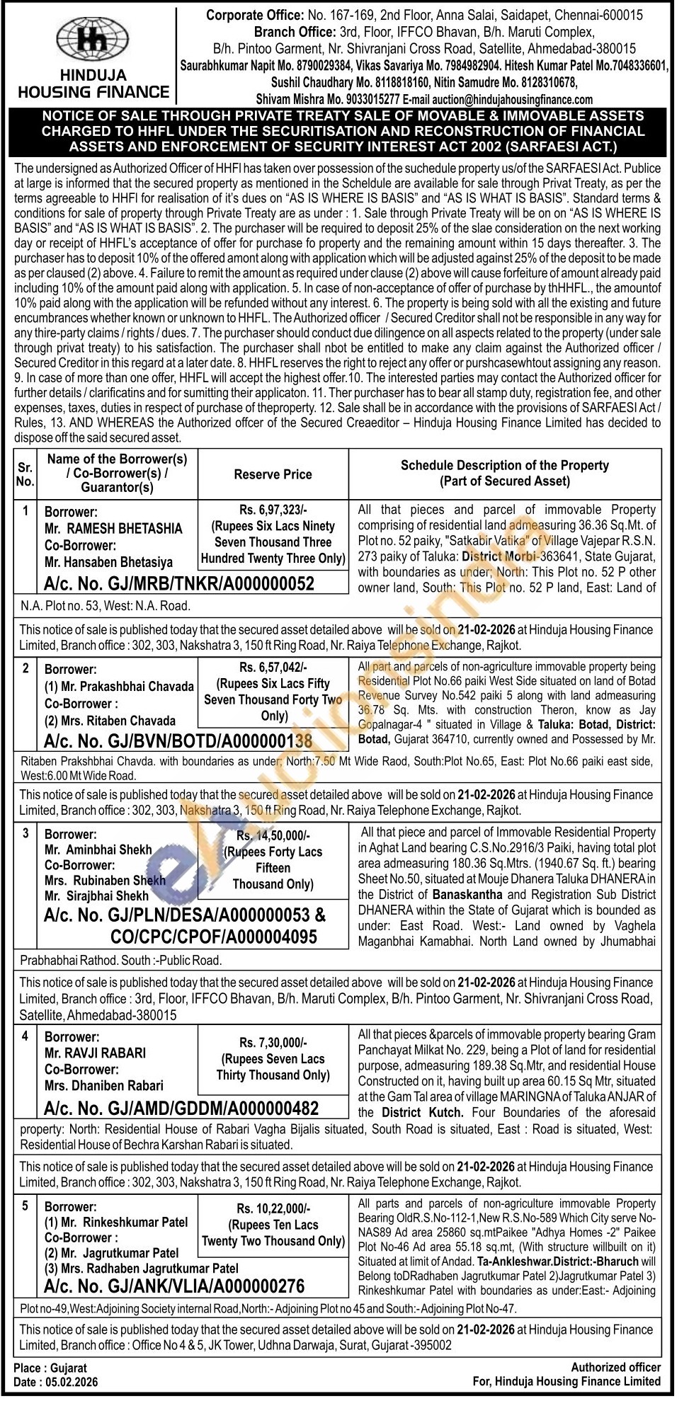 All that pieces &parcels of immovable property bearing Gram Panchayat Milkat No. 229, being a Plot of land for residential purpose, admeasuring 189.38 Sq.Mtr, and residential House Constructed on it, having built up area 60.15 Sq Mtr, situated at the Gam Tal area of village MARINGNA of Taluka ANJAR of the District Kutch. Four Boundaries of the aforesaidproperty: North: Residential House of Rabari Vagha Bijalis situated, South Road is situated, East Road is situated, West Residential House of Bechra Karshan Rabari is situated.
