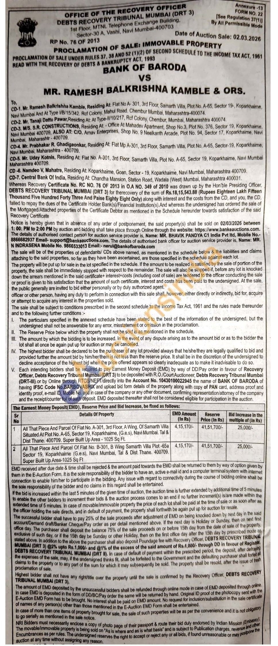 All That Piece And Parcel Of Flat No. A-301, 3rd Floor, A Wing, Of Samarth Villa Situated At Plot No. A-65, Sector 19, Koparkhaine, (G.e.s), Navi Mumbai. Tal & Dist Thane. 400709. Super Built Up Area-1025 Sq Ft.