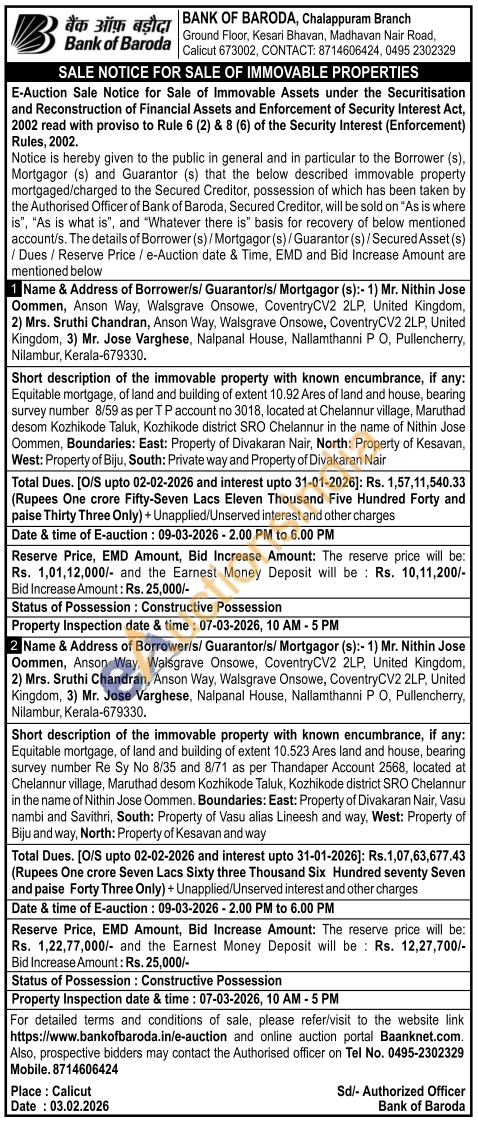 Short description of the immovable property with known encumbrance, if any: Equitable mortgage, of land and building of extent 10.523 Ares land and house, bearing survey number Re Sy No 8/35 and 8/71 as per Thandaper Account 2568, located at Chelannur village, Maruthad desom Kozhikode Taluk, Kozhikode district SRO Chelannur in the name of Nithin Jose Commen. Boundaries: East: Property of Divakaran Nair, Vasu nambi and Savithri, South: Property of Vasu alias Lineesh and way, West: Property of Biju and way, North: Property of Kesavan and way