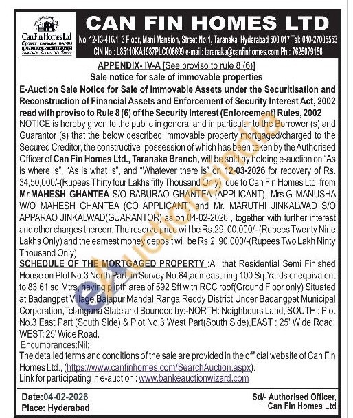 SCHEDULE OF THE MORTGAGED PROPERTY : All that Residential Semi Finished House on Plot No.3 North Part, in Survey No.84, admeasuring 100 Sq. Yards or equivalent to 83.61 sq. Mtrs, having plinth area of 592 Sft with RCC roof (Ground Floor only) Situated at Badangpet Village, Balapur Mandal, Ranga Reddy District, Under Badangpet Municipal Corporation, Telangana State and Bounded by:-NORTH: Neighbours Land, SOUTH: Plot No.3 East Part (South Side) & Plot No.3 West Part(South Side), EAST: 25' Wide Road, WEST: 25' Wide Road