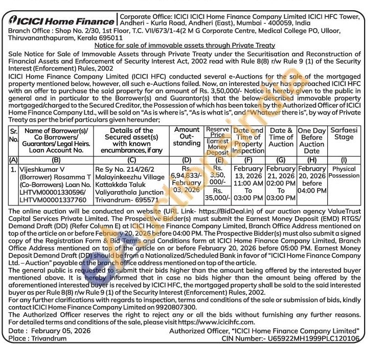 Re Sy No. 214/26/2 Malayinkeezhu Village Kattakkda Taluk Valiyarathala Junction Trivandrum-695571