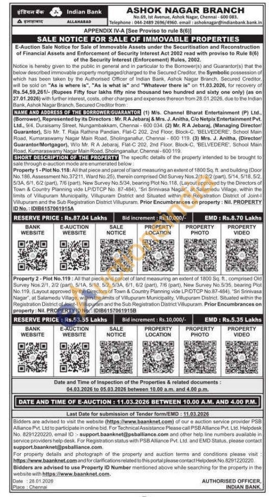 Property 1-Plot No. 118: All that piece and parcel of land measuring an extent of 1800 Sq. ft. and building (Door No. 186, Assessment No, 37211, Ward No.25), therein comprised Old Survey Nos. 2/1, 2/2 (part), 5/14, 5/18,5/2, 5/3A, 6/1, 6/2 (part), 7/6 (part), New Survey No.5/34, bearing Plot No. 118, (Layout approved by the Directors of Town & Country Planning vide LP/DTCP No. 87-484), 'Sri Srinivasa Nagar, at Salamedu Village, within the limits of Villupuram Municipality, Villupuram District and Situated within the Registration District of Joint-Villupuram and the Sub Registration District Villupuram