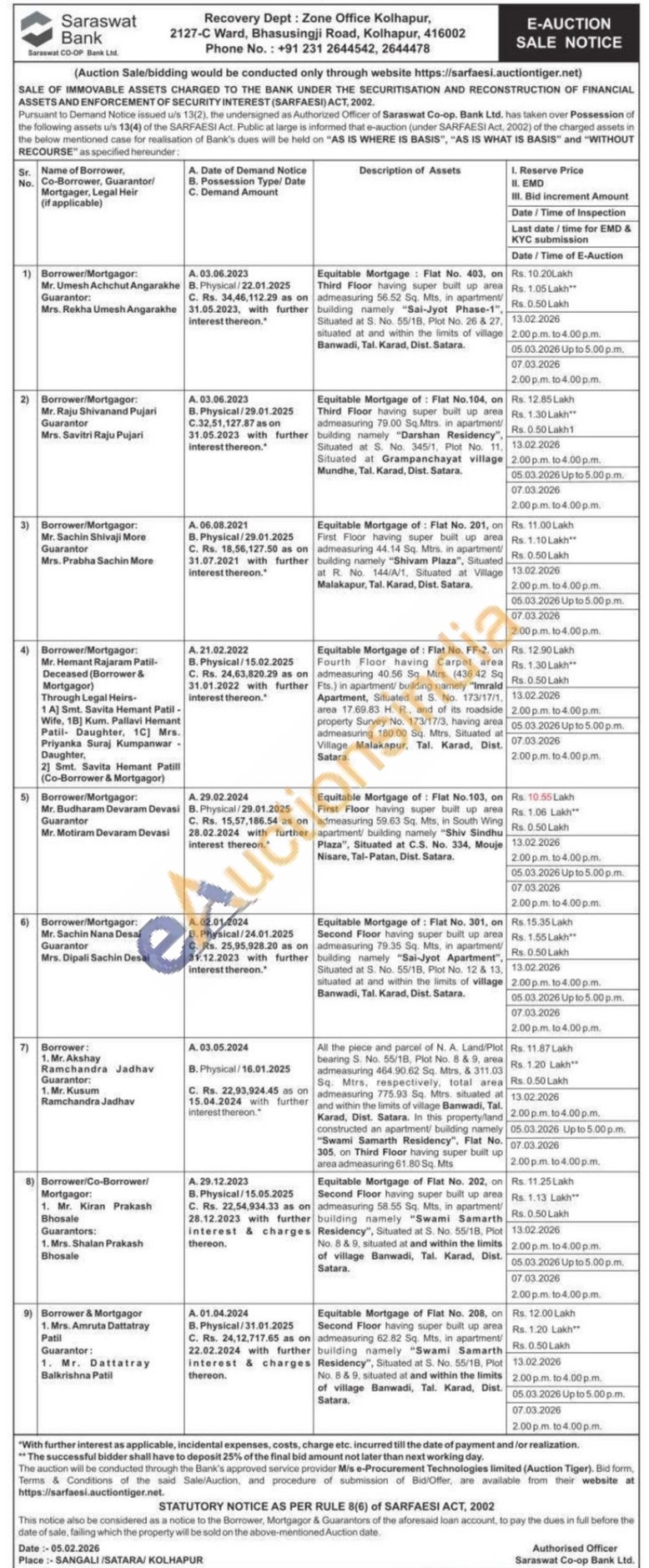 Equitable Mortgage of Flat No.103, on First Floor having super built up area admeasuring 59.63 Sq. Mts, in South Wing apartment building namely "Shiv Sindhu Plaza", Situated at C.S. No. 334, Mouje Nisare, Tal-Patan, Dist. Satara.