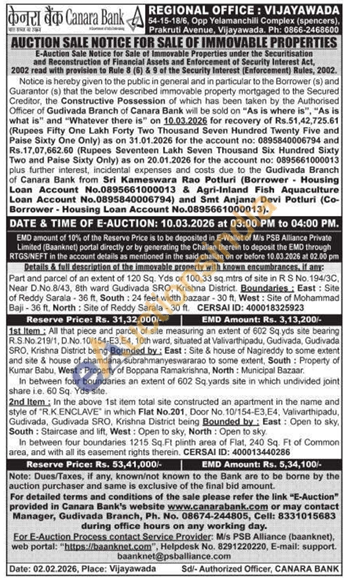 2) 1st item: All that piece and parcel of site measuring an extent of 602 Sq yds site beanng R.S.No 219/1, D. No. 10/154-E3,E4, 10th ward, situated at Valivarthipadu, Gudivada, Gudivada SRO, Krishna District being Bounded by: East: Site & house of Nagireddy to some extent and site & house of chamdana subrahmanyeswararao to some extent, South: Property of Kumar Babu, West: Property of Boppana Ramakrishna, North: Municipal Bazaar. In between four boundaries an extent of 602 Sq yards site in which undivided joint share le 60 Sq. Yds site. 2nd Item: In the above 1st item total site constructed an apartment in the name and style of "R.K.ENCLAVE in which Flat No.201, Door No. 10/154-E3,E4, Valivarthipadu, Gudivada, Gudivada SRO, Krishna District being Bounded by: East: Open to sky, South: Staircase and lift, West: Open to sky, North: Open to sky In between four boundaries 1215 Sq. Ft plinth area of Flat, 240 Sq. Ft. of Common area, and with all its easement rights therein, CERSAI ID: 400013440286