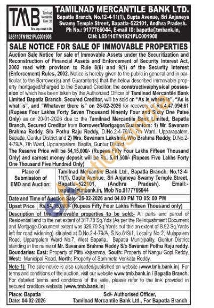 Description of the immovable properties to be sold: All parts and parcel of Residential land to the net extent of 317.78 Sq. Yds (As per the Relinqushment Document and Mortgage Document extent was 326.70 Sq. Yards out this an extent of 8.92 Sq. Yards left for road widening) situated at D.No.2-4-79/A, S.No.619/1, Locality No.2, Mulapalem Road, Upparpalem Ward No 7, West Bapatia, Bapatia Municipality, Guntur District standing in the name of Mr. Savanam Brahma Reddy Sio Savanam Pothu Raju reddy. Boundaries: East: Property of Pittu Vajramma, South: Property of Nangu Gopi Reddy, West: Municipal Road, North: Property of Sammela Venkata Reddy.