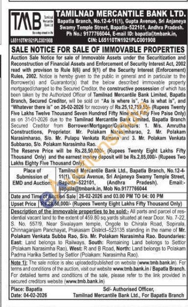 Description of the immovable properties to be sold:: All parts and parcel of res-idential vacant land to the extent of 459.80 sq yards situated at near Door. No. 7-22, S. No. 557/9, Near Sivalayam temple, Ongole to Chirala Road, Sopirala, Chinnaganjam Panchayat, Prakasam District-523135 standing in the name of Mr. Polakam Venkata Subba Rao, Sio. Mr. Polakam Narasimha Rao. Boundaries: East: Land belongs to Railways, South: Remaining Land belongs to Settior (Polakam Narasimha Rao), West: R and B Road, North: Land belongs to Polakam Padma Harika Settled by Setlior (Polakam: Narasimha Rao),