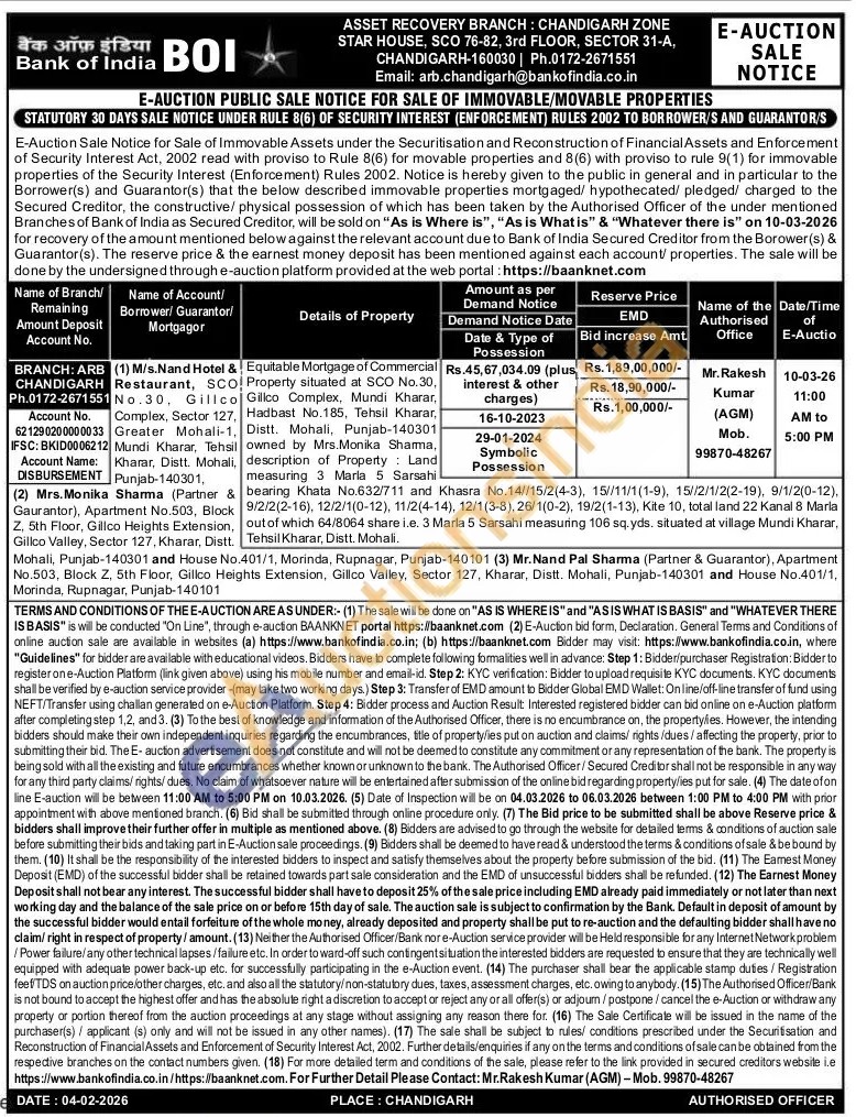 Property situated at SCO No.30, co Gilico Complex, Mundi Kharar, 27. Hadbast No.185, Tehsil Kharar, -1, Distt. Mohali, Punjab-140301 owned by Mrs.Monika Sharma, measuring 3 Marla 5 Sarsahi & bearing Khata No.632/711 and Khasra No.14//15/2(4-3), 15//11/1(1-9), 15//2/1/2(2-19), 9/1/2(0-12), ck 9/2/2(2-16), 12/2/1(0-12), 11/2(4-14), 12/1(3-8), 26/1(0-2), 19/2(1-13), Kite 10, total land 22 Kanal 8 Marla on, out of which 64/8064 share i.e. 3 Marla 5 Sarsahi measuring 106 sq. yds. situated at village Mundi Kharar, stt. Tehsil Kharar, Distt. Mohali