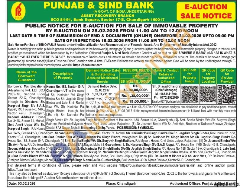 House No. 188, Sector 19-A, Chandigarh UT in the name Orof Sh. Narinder Pal Singh Bindra S/o Sh. Jagdish Singh . Bindra and Late Smt. Ranbirin Singh Bindra Sio Sh. Jagdish Singh Bindra Resident of House No. 188, Sector 19-A, Chandigarh, (2). Smt. Bonita Bindra W/o Sh. Suryavir Singh Rathore, Resident of Mysore House, Civil Lines, Jaipur, Rajasthan, (3). Dr. Jasmeet Bindra Wo Sh. Aviri Vats, Resident of Defence Enclave, Zirakpur, Se District SAS Nagar, Mohali, Measuring 500 Sq. Yards. POSSESSION: SYMBOLIC.