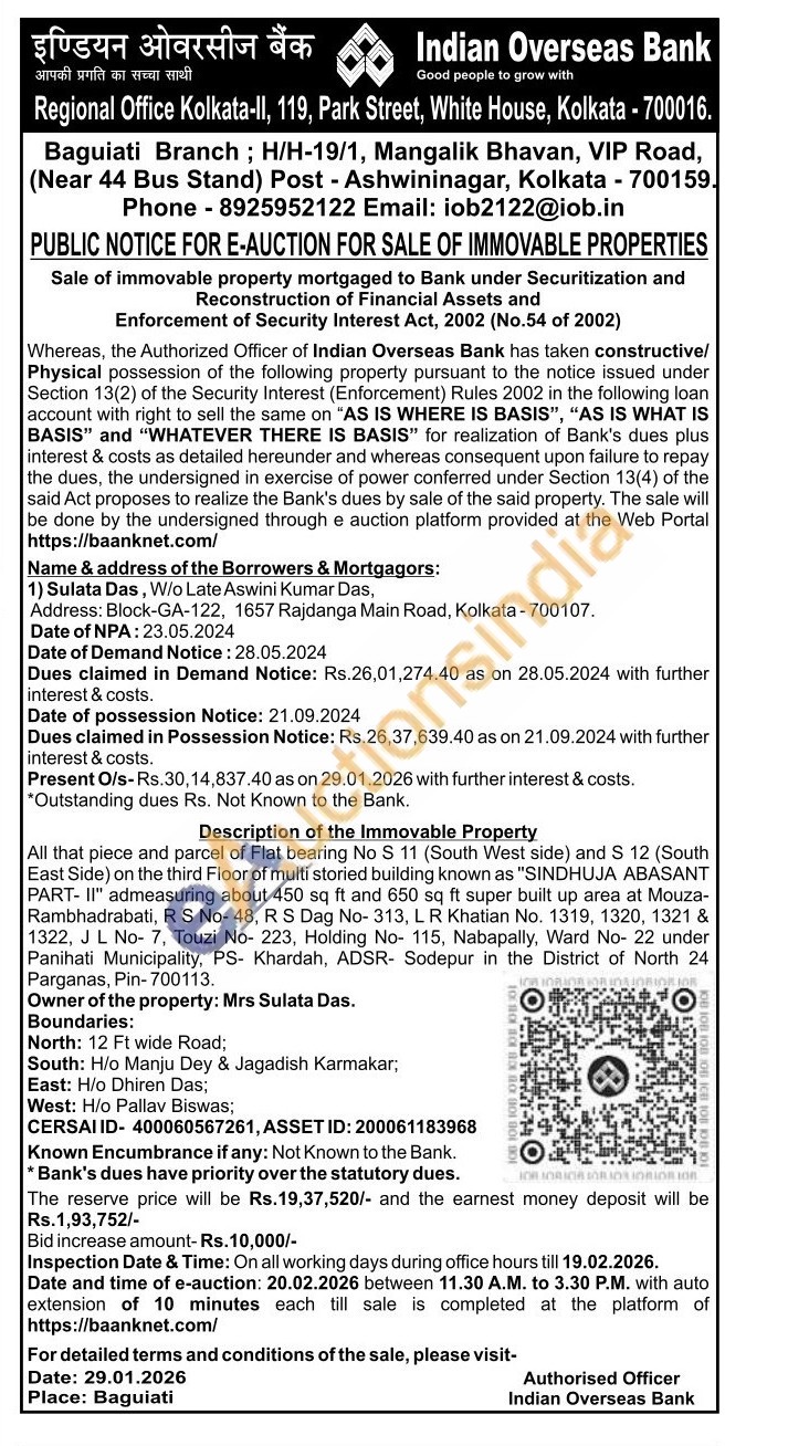 All that piece and parcel of Flat bearing No S 11 (South West side) and S 12 (South East Side) on the third Floor of multi storied building known as "SINDHUJA ABASANT PART- II" admeasuring about 450 sq ft and 650 sq ft super built up area at Mouza-Rambhadrabati, R S No-48, R S Dag No-313, LR Khatian No. 1319, 1320, 1321 & 1322, J L No- 7, Touzi No- 223, Holding No- 115, Nabapally, Ward No- 22 under Panihati Municipality, PS- Khardah, ADSR- Sodepur in the District of North 24 Parganas, Pin-700113