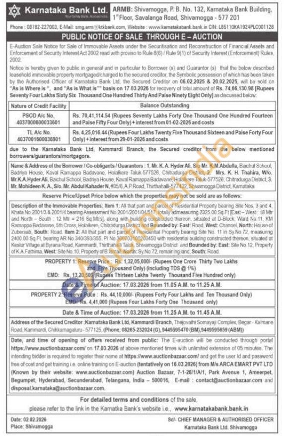 Description of the Immovable Properties: Item 1: All that part and parcel of Residential Property bearing Site Nos 3 and 4. Khata No 2001/3 & 2001/4 bearing Assessment No 2001/2001/04/517, totally admeasuring 2325.00 Sq Ft East-West 18 Mtr and North-South 12 Mr216 Sq Mitrs), along with building constructed thereon, situated at D-Block, Ward No. 11, KM Ramappa Badavane, 5th Cross, Holalkere, Chitradurga District and Bounded by: East: Road, West: Channel, North: House of Zubersab, South: Road.