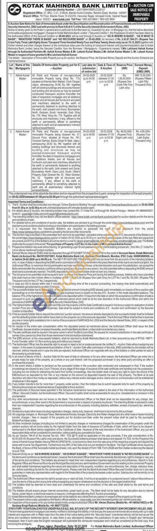 All Parts and Parcels of non-agriculture immovable Property being Shop No. 776. situated at Khanda Atish Market, Choti Chopar Jaipur, admeasuring 34.66 Sq. Mtr. together with all existing buldings and structurees thereon and building and structures as may be erected constructed thereupon anytime from after the date of respective mortgages and all additions thereto and all fixtures and fumiture's and plant and machinery attached to the earth or permanently fastened to anything attached to the earth, both present and future. Boundaries North Godown, South, Verandah, East Shop No. 776, West Shop No. 774. Together with al structures and machinery, if any, affixed to the earth or permanently affixed to something attached to earth and all easementary mamool rights annexed thereto