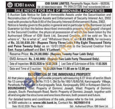 All that piece and parcel immovable property admeasuring 6.07 Ares of land in Block No 12 comprised in Re Sy No 77/2-1, Old Sy No 180/1/8/60/58, Kanjirappally Village, Parathodu Panchayath in Kanjirappally Taluk, Kanjirappally SRO in Kottayam District. BOUNDARIES: East: Property of Dominic Joseph, West: Property of Dominic Joseph, South: Panchayath Road, North: Property of Dominic Joseph, together with all and singular the structures and erections thereon, both present and future.